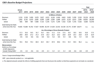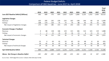 The CBO April 2018 baseline for the 2018-2027 period includes a $1.6 trillion higher budget deficit projection than the June 2017 baseline. This is due to the 2017 Tax Act and other spending legislation. The effect from the legislation is partially offset by economic feedback and technical changes.[4]
