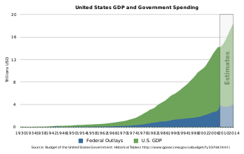 إجمالي الإنفاق السنوي في الولايات المتحدة للفترة 1930–2014 ون.م.إ. للمقارنة.