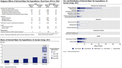 مخططات مكتب ميزانية الكونگرس يوضح إنفاق حوالي 1.0 تريليون دولار خلال عام 2013 (أي الإعفاءات والخصومات والمعدلات التفضيلية) وتوزيعها على مجموعات الدخل. تمتع أعلى 20% من أصحاب الدخل 50% بالاستفادة من هذه الإعفاءات الضريبية؛ وهم أيضاً يدفعون حوالي 70% من ضرائب الدخل الفدرالية.