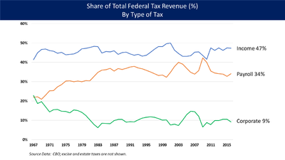 بيانات مكتب ميزانية الكونگرس حول حصة الدخل الفدرالي الأمريكي المجموع حسب نوع الضريبة في الفترة 1967-2016. زادت ضرائب الرواتب التي يدفعها جميع الأجراء، كحصة من إجمالي دخل الضرائب الفدرالية، في حين تراجعت ضرائب الشركات. نُقلت ضرائب الدخل ضمن النطاق، في عهد الرئيسين ريگان وجورج بوش. قام بوش بتخفيض ضريبة الدخل، ورفعها كلنتون وأوباما من أجل الحصول على أكبر قدر من الدخل.[9]