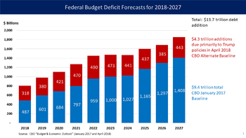 The CBO forecast in April 2018 that under current policy, the sum of annual federal budget deficits (debt increases) would be $13.7 trillion over the 2018-2027 time period. This is $4.3 trillion higher (46%) than the CBO January 2017 baseline of $9.4 trillion. The change is mainly due to the Tax Cuts and Jobs Act of 2017.[4]