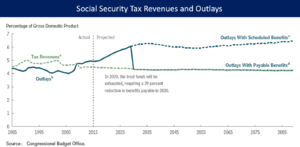 توقعات مكتب ميزانية الكونگرس للعائدات الضريبية وتكاليف الضمان الاجتماعي من 2015-2085. بموجب القانون الحالي، من المتوقع أن تتجاوز التكاليف العائدات، مما يستلزم اقتطاع 29% من المدفوعات بدءاً من حوالي عام 2030 بمجرد أن يستنفد صندوق الضمان الاجتماعي.[10]