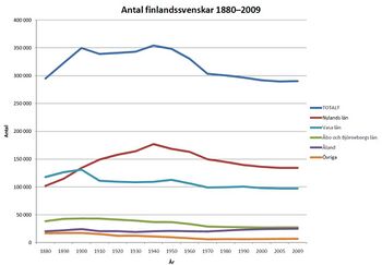 According to a 2007 statistical analysis made by Fjalar Finnäs، the population of the minority group is stable,[14][15] and may even be increasing slightly in total numbers since more parents from bilingual families tend to register their children as Swedish speakers.[16] It is estimated that 70% of bilingual families—that is, ones with one parent Finnish-speaking and the other Swedish-speaking—register their children as Swedish-speaking.[17]