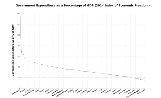 This is a list of countries by government spending as a percentage of gross domestic product (GDP) for the listed countries, according to the 2014 Index of Economic Freedom[1] by The Heritage Foundation and The Wall Street Journal. Tax revenue is included for comparison. These statistics use the United Nations' System of National Accounts (SNA), which measures the government sector differently than the U.S. Bureau of Economic Analysis (BEA). The SNA counts as government spending the gross cost of public services such as state universities and public hospitals. For example, the SNA counts the entire cost of running the public-university system, not just what legislators appropriate to supplement students' tuition payments. Those adjustments push up the SNA's measure of spending by roughly 4 percent of GDP compared with the standard measure tallied by the BEA.[2]