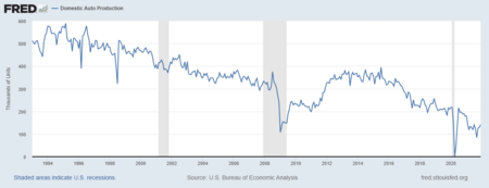 في بداية الوباء، توقع مصنعو السيارات بشكل غير صحيح أن المبيعات ستنخفض، وألغوا طلبات الرقائق، ولم يكونوا مستعدين لتلبية الطلب.[44] كان لدى مصنعي الرقائق مزيد من الالتزامات من قطاع تكنولوجيا المعلومات، مما قلل من سعة رقائق السيارات.[42]كما أوقفت فورد آلاف المركبات غير المكتملة في كنتكي سپيدواي بينما كانت الشركة تنتظر رقائق للانتهاء من تجميع تلك السيارات.[45]وقد خططت تويوتا لخفض إنتاج السيارات في جميع أنحاء العالم بنسبة 40 بالمائة في سبتمبر 2021،[46] بينما أعلنت جنرال موتورز أنها ستوقف إنتاج جميع السيارات تقريباً في مصانعها بأمريكا الشمالية لمدة أسبوع أو أسبوعين من نفس الشهر.[47] خلال الربع الثالث من عام 2021، لم يكن هناك سوى ثلثي مبيعات السيارات الجديدة في الولايات المتحدة كما كانت خلال نفس الفترة الزمنية من عام 2020، حيث لم يتمكن العرض من تلبية الطلب.[48]كما أغلقت اوپل مصنعها في آيزناخ حتى عام 2022 بسبب النقص، مما تسبب في تسريح 1300 عامل مؤقتاً.[49]