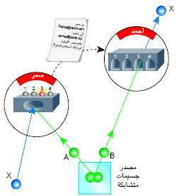 يخطط أحمد وسمر للقيام بعملية نقل بعدي لفوتون، ولدى التحضير لذلك يتشاركان في زوج مساعد متشابك من الفوتونات فتأخذ سمر الفوتون A، في حين يأخذ أحمد الفوتون B. وبدل من إجراء قياس عليهما يقوم كل منهما بخزن فوتونه من دون أن يشوش حالة التشابك المرهفة [انظر الشكل العلوي في الصفحة 42].