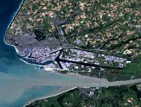 Administratively, Le Havre is a commune in the Normandy region in the west of the department of Seine-Maritime. The urban area of Le Havre corresponds roughly to the territory of the Agglomeration community of Le Havre (CODAH)[13] which includes 17 communes and 250,000 people.[14] It occupies the south-western tip of the natural region of Pays de Caux where it is the largest city. Le Havre is sandwiched between the coast of the Channel from south-west to north-west and the estuary of the Seine to the south.