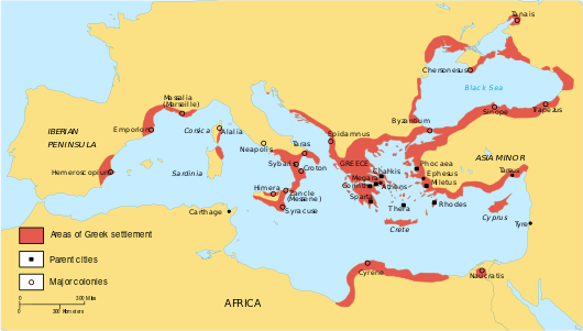 The earliest Greek colonies were on Sicily. Many of these were founded by people from Chalcis, but other Greek states, such as Corinth and Megara were also responsible for early colonies in the area.[45] By the end of the eighth century BC, Greek settlements in southern Italy were also well established.[46] In the seventh century, Greek colonists expanded the areas that they settled. In the west, colonies were founded as far afield as Marseilles. In the east, the north Aegean, the Sea of Marmara, and the Black Sea all saw colonies founded.[47] The dominant coloniser in these parts was Miletus.[48] At the same time, early colonies such as Syracuse and Megara Hyblaea began to themselves establish colonies.[47]