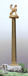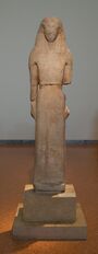 The best-known types of archaic sculpture are the kouros and kore, near life-size frontal statues of a young man or woman,[107] which were developed around the middle of the seventh century BC in the Cyclades.[108] Probably the earliest kore produced was the Dedication of Nikandre, which was dedicated to Artemis at her temple on Delos between 660 and 650 BC,[109] while kouroi began to be created shortly after this.[110] Kouroi and korai were used to represent both humans and divinities.[111] Some kouroi, such as the Colossus of the Naxians from around 600 BC, are known to represent Apollo,[108] while the Phrasikleia Kore was meant to represent a young woman whose tomb it originally marked.[112]