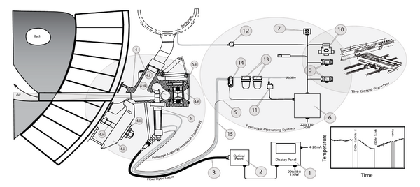 The tuyère pyrometer is an optical instrument for temperature measurement through the tuyeres which are normally used for feeding air or reactants into the bath of the furnace.