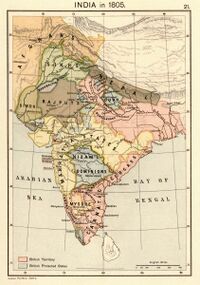 The Cis-Sutlej states were a group of Sikh[24] states in the Punjab region lying between the Sutlej River to the north, the Himalayas to the east, the Yamuna River and Delhi district to the south, and Sirsa District to the west. The Cis-Sutlej states included Kalsia, Kaithal, Patiala State, Nabha State, Jind State, Thanesar, Maler Kotla, Ludhiana, Kapurthala State, Ambala, Ferozpur and Faridkot State, among others. These states fell under the suzerainty of the Scindhia, appointed by Mughal Emperor Shah Alam II as viceregent (Vakil-i-Mutlaq) of the Mughal empire,[25][26] after a brief Sikh-Maratha treaty in 1785 where according to the treaty, Scindhia would recognize the political supremacy of the Sikhs in the Punjab whereas the Sikhs would forbear from attacking the adjoining territories of Delhi.[27] Before the Second Anglo-Maratha War of 1803–1805, the Marathas lost all influence on the territory to the British East India Company.[28][29]