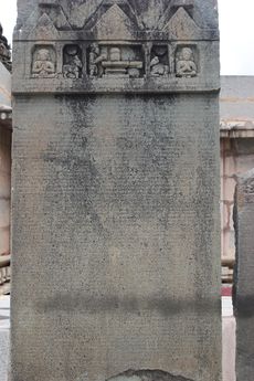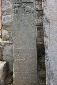 A Hero stone with old Kannada inscription (1115 AD) أثناء حكم ڤيكراماديتيا السادس في معبد كدارش‌ڤارا في Balligavi