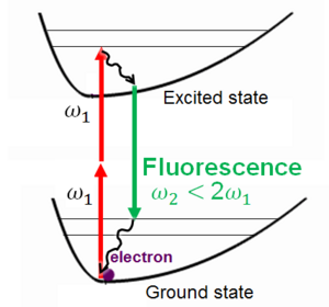 Two-photon excitation of a fluorophore (a fluorescent molecule) leads to two-photon-excited fluorescence where the excited state produced by TPA decays by spontaneous emission of a photon to a lower energy state.