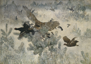 Hawk and Black-Game (Bruno Liljefors, 1884), a painting of a goshawk at the moment of catching a black grouse