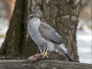 Birds are usually the primary prey in Europe, constituting 76.5% of the diet in 17 studies. Studies have shown that from several parts of the Eurasian continent from Spain to the Ural Mountains mammals contributed only about 9% of the breeding season diet. However, mammals may be slightly underrepresented in Eurasian data because of the little-studied presence of mammals as a food source in winter, particularly in the western and southern portions of Europe where the lack of snowfall can allow large numbers of rabbits.[12][77] Staple prey for northern goshawks usually weighs between 50 و 2،000 g (1.8 و 70.5 oz), with average prey weights per individual studies typically between 215 و 770 g (7.6 و 27.2 oz).[12][56][72][78] In the Netherlands, male prey averaged 277 g (9.8 oz) whereas female prey averaged 505 g (17.8 oz), thus a rough 45% difference.[3] Northern goshawks often select young prey during spring and summer, attacking both nestling and fledgling birds and infant and yearling mammals, as such prey is often easiest to catch and convenient to bring to the nest. In general, goshawks in Fennoscandia, shift their prey selection to when the birds produce their young: first waterfowl, then quickly to corvids and thrushes and then lastly to grouse, even though adults are also freely caught opportunistically for all these prey types.[12][79] This is fairly different from Vendsyssel, Denmark, where mostly adult birds were caught except for thrushes and corvids, as in these two groups, the goshawks caught mostly fledglings.[80]