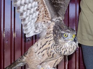 Goshawks sometimes become habitual fowl killers. This juvenile was caught pursuing chickens inside a hen house.