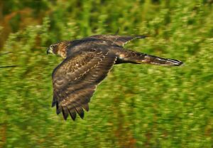 Northern goshawks rarely vary from their perch-hunting style that typifies the initial part of their hunt but seems to be able to show nearly endless variation to the concluding pursuit.[65] Hunting goshawks seem to not only utilize thick vegetation to block them from view for their prey (as typical of Astur species) but, while hunting flying birds, they seem to be able to adjust their flight level so the prey is unable to see its hunter past their own tails.[12] Once a prey item is selected, a short tail-chase may occur. The northern goshawk is capable of considerable, sustained, horizontal speed in pursuit of prey with speeds of 38 mph (61 km/h) reported.[3] While pursuing prey, northern goshawks has been described both "reckless" and "fearless", able to pursue their prey through nearly any conditions.[13] There are various times goshawks have been observed going on foot to pursue prey, at times running without hesitation (in a crow-like, but more hurried gait) into dense thickets and brambles (especially in pursuit of galliforms trying to escape), as well as into water (i.e. usually waterfowl).[66][67][68] Anecdotal cases have been reported when goshawks have pursue domestic prey into barns and even houses.[69]