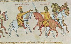 Basil victorious in a wrestling match against a Bulgarian champion (far left), from the Madrid Skylitzes manuscript.