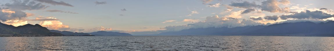 The lake serves as a backdrop to all of مدينة دالي and sandwiches Dali Town in the west against the جبل تسانگ. The lake's head is at Shangguan Town, its northern extremity, and its southernmost point is at Xiaguan Town. The lake receives water from the Miju and Mici Rivers in the north, the Bolou River in the east, and smallers streams from the Cang Mountains in the west. Yangbi River, to the south, is the lake's outlet and eventually flows into the Lancang River (Mekong River).