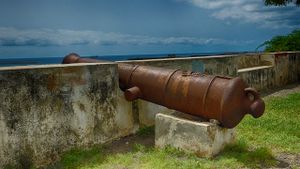 مدفع برتغالي، عليه درع رمزي، في پرايا، الرأس الأخضر