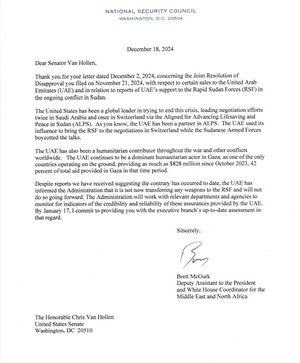 خطاب برت مگرك للسناتور ڤان هولن بشأن تسليح الإمارات لقوات الدعم السريع، 18 ديسمبر 2024.