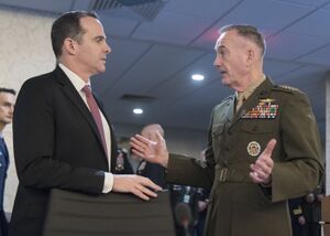 Marine Corps Gen. Joseph F. Dunford, Jr., chairman of the Joint Chiefs of Staff, speaks to special envoy for the Global Coalition to Counter the Islamic State of Iraq and the Levant, Brett H. McGurk, during the 2017 Chiefs of Defense Conference at Fort Belvoir, Va., Oct 24, 2017