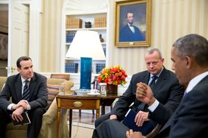 الرئيس باراك أوباما يلتقي بالجنرال المتقاعد جون آلن، المبعوث الرئاسي الخاص للتحالف العالمي لمحاربة داعش، وبرت مگرك، نائب المبعوث الرئاسي الخاص، على اليسار، في المكتب البيضاوي، 16 سبتمبر 2014.