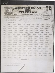 جزء من البرقية كما تم فك شفرتها من قِبل كاسري الشفرات في المخابرات البحرية البريطانية. ولأن أريزونا كانت قد انضمت للولايات المتحدة في 1912، فإن كلمة أريزونا لم تكن في كتاب الشفرة الألماني ولذلك فقد كـُسِرت إلى مقاطع صوتية.