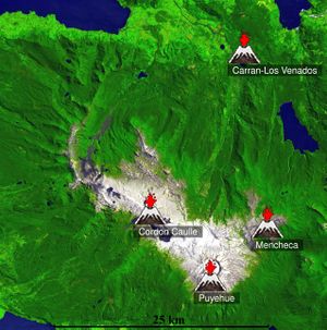 ASTER mapping showing the location of Puyehue, Cordón Caulle, Mencheca and the Carrán volcanics. Cordillera Nevada is the semicircular structure northwest of Cordón Caulle.