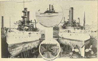 "In the Navy Yard of Puget Sound", in Seattle and the Orient (1900). Two ships are shown in drydock; the two circular insets are titled "Iowa coming up the Sound" (upper) and "Torpedoboat Rowan" (lower).
