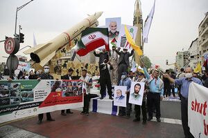 شهيد حاج قاسم: هو صاروخ باليستي إيراني الصنع، تفوق سرعته سرعة الصوت بـ12 مرة، ما يمكنه الإفلات من أي دفاع صاروخي.[444] يبلغ مدا هذا الصاروخ أكثر من 1400 كيلومتر، ويمكن زيادة هذا المدى إلى حوالي 1700 و 1800 كيلومتر.[445][446][447][448] ويتم تشغيله بمحرك يعمل بالوقود الصلب، وتُعَد محركات الصواريخ التي تعمل بالوقود الصلب من المجالات التي حققت فيها جمهورية إيران أداءً جيداً بشكل خاص في الآونة الأخيرة. في وقت سابق من عام 2020م، وقال الحرس الثوري الإسلامي، مسلطاً الضوء على نجاحاته، إن تقنيات الوقود الصلب تُستَخدَم في أنظمة الإطلاق الفضائية. مما لا شك فيه أن هناك إحتمال أن يَستَخدِم صاروخ "الحاج قاسم" جزء من هذه الإبتكارات الجديدة.[449] وقد تم إختباره ضد نظام دفاع صاروخي وقد نجا من الإعتراض. ان هذا السلاح الدقيق تماماً، والذي يتم إطلاقه بشكل مائل.[63] يبلغ وزنه 7 أطنان وبرأس حربي يزن 500 كيلوغرام، اما طوله فيبلغ 11 متراً.[65] وقد نشرت وسائل الإعلام الإيرانية، الخميس 22/8/2020، مقطع فيديو لمراحل تصنيع واختبار وإطلاق الصاروخ الباليستي الجديد "الحاج قاسم".[450] وتزامناً مع اليوم الوطني للصناعات الدفاعية وبرعاية الرئيس الإيراني حسن روحاني، تم الإعلان عن عدد من إنجازات وزارة الدفاع وإسناد القوات المسلحة الإيرانية في المجالات المختلفة والتي صُمِمَت وصُنِعَت على يد علماء وخبراء هذه الوزارة.[451] حيث أعلن وزير الدفاع الإيراني العميد أمير حاتمي، يوم الخميس 20/8/2020، عن التوصل إلى صنع صاروخ باليستي يعمل بالوقود الجامد أُطلِقَ عليه اسم الحاج قاسم، جنباً إلى جنب مع صاروخ كروز بحري بمدى 1000 كيلومتر باسم (أبو مهدي). وأشار حاتمي، خلال مراسم إزاحة الستار عن منجزات جديدة لوزارة الدفاع، إلى التقدم الكبير الذي حققته الصناعة الدفاعية في البلاد بعد إنتصار الثورة الإسلامية خاصةً خلال الأعوام الثلاثة الأخيرة إعتماداً على مبدئين أساسيين هما الإكتفاء الذاتي وتلبية حاجات البلاد"، وقال إن "أبو مهدي" هو صاروخ كروز بحري قادر على تخطي منظومات دفاع الأعداء، ويُطلَق من الأعماق وسيتم تزويد القوات البحرية به قريباً.[452]