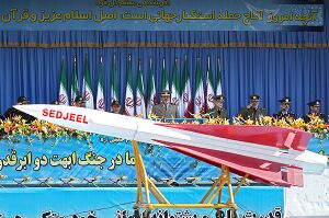 سجيل-2: هو أول صاروخ إيراني بعيد المدى يعمل بالوقود الصلب، وأثقل الصواريخ الإيرانية. ويُعَد من الجيل المتطور لصواريخ أرض-أرض الإيرانية، تم صنعه بجمهورية إيران وتجربته في نوفمبر 2008م لأول مرة، ويصل مداه من (2000-2510) کيلومتر وذلك اعتماداً على رأسه الحربي، ويعمل بالوقود الصلب ضمن مرحلتين خلافاً لصاروخ شهاب 3 الذي يعمل بالوقود السائل وفي مرحلة واحدة، وفق وكالة الأنباء الإيرانية (إرنا). ويقول خبراء إن الصاروخ الجديد يضع إسرائيل وجنوب شرقي أوروبا في مرمى نيران الجمهورية الإسلامية.[365][366][367] وأفادت وكالة مهر للأنباء نقلاً عن موقع مركز وثائق الثورة الإسلامية ان صاروخ سجيل قد ظهر إلى العلن قبل نحو عقد من الآن على غرار صاروخ قدر (النموذج المطور عن صاروخ شهاب 3) وهو أحد أفضل الصواريخ الإيرانية. وقد صُنِعَ هذا الصاروخ ضمن مشروع عاشوراء. ان هذا الصاروخ يتم تجهيزه للإطلاق بسرعة وهذا يقلل احتمال تعرض منصة الإطلاق والصاروخ الجاهز للانطلاق للهجوم قبل الإطلاق. ان سرعة انطلاق هذا الصاروخ العالية جداً تقلل فرص رصده في المراحل الأولى من الإطلاق وهكذا تصبح فرص العدو لتدمير هذا الصاروخ أثناء تحليقه ضئيلة جداً لأن صاروخ سجيل يعمل بطريقة باليستية وان سرعته العالية تمنع الأنظمة المضادة للصواريخ الباليستية من اعتراضه. وقد أُعلِنَ ان مدى هذا الصاروخ هو 2000 كيلومتر وصنع في نسختين سجيل 1 وسجيل 2 وان وزنه الدقيق هو 23540 كيلوغرام، ولصاروخ سجيل محركين ويُطلَق من منصات ثابتة ومتحركة وهو يخرج من الغلاف الجوي بعد إطلاقه ثم يسلك مساراً افقياً خارج الغلاف الجوي وبعد وصوله إلى أعلى الهدف يدخل الصاروخ مجدداً الغلاف الجوي ويسقط بسرعة عالية على هدفه. وتبلغ سرعة عودة صاروخ سجيل إلى الغلاف الجوي والسقوط على الهدف حوالي 13 ماخ (حوالي 4300 متر في الثانية) وهذا ما يجعل كل الأنظمة المضادة للصواريخ عاجزة عن اعتراضه. ويعتقد الكثير من الخبراء ان صاروخ سجيل الباليستي والبعيد المدى هو جزء من خيارات إيران للرد على أي اعتداء إسرائيلي ولذلك أصبح محط اهتمام عالمي.[368] اما عمل صاروخ سجيل فهو يعمل ضمن مرحلتين، الأولى تعمل بالوقود الصلب عند الإطلاق والثانية تعمل بالوقود السائل في مرحلة التوجيه ونظام التحكم، وتبدأ المرحلة الثانية بالعمل بعد انتهاء المرحلة الأولى وانفصال جزء من الصاروخ. ان الأستفادة من تقنية الوقود الجامد المركب في هذا الصاروخ يعزز بالإضافة إلى سرعته الفائقة، زيادة فترة الأحتفاظ به في المخازن. أن منظومة توجيه صواريخ سجيل تتمتع بإمكانيات كبيرة تمنح الصاروخ الدقة الفائقة في إصابة الهدف والتي تضاعف من دورها في العمليات الحربية بشكل كبير. وان صاروخ سجيل-2 هو من أحدث افراد عائلة الصورايخ التي تعمل بالوقود الصلب. ان هذا الصاروخ يتميز بسرعته الفائقة ودقته العالية في إصابة الهدف المنشود، ويتمتع بمكانة حصرية في أنظمة الملاحة مقارنةً مع بقية صورايخ أرض- أرض الإيرانية. ان الصواريخ التي تعمل بالوقود السائل، تحتاج إلى وقت طويل نسبياً لملئ مخازنها بالوقود وتهيئتها قبل الإطلاق، ان هذه العملية تمنح العدو فرصة لتحديد أماكن منصات هذه الصواريخ، ولأجل التغلب على هذه المشكلة تم صناعة اسطوانات كمنصات لإطلاق هذه الصواريخ تُدفَن في داخل الأرض ويمكن شحنها بالوقود اللازم والأحتفاظ بها لأشهر عدة.[369][370] وذكرت وكالة أنباء فارس في 12 نوفمبر 2008م ان إيران أجرت بنجاح تجربة إطلاق جديدة لصاروخ ارض-أرض حديث. ونقلت وكالة فارس عن وزير الدفاع الإيراني العميد مصطفى محمد نجار قوله: ان تجربة إطلاق الصاروخ هو في إطار إستراتيجية الدفاع الصاروخي والأنشطة التقليدية في إيران، وإنها لا تهدف إلا لأغراض الدفاع، وتعزيز السلام والاستقرار في المنطقة ولن تُستَخدَم ضد أي بلد. يُذكَر أن رحلة الطيران لاختبار الصاروخ سجيل إنطلقت بواسطة فيالق الحرس الثوري في وحدة العمليات في المناورات العسكرية التي جرت في 10 نوفمبر، 2008م من موقع أُنشئَ حديثاً على مشارف مدي