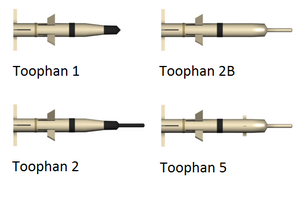 طوفان 2-B: تحسين أبعَد للصاروخ طوفان 2 ذو رأس حربي أثقل وقدرة على اختراق 900 ملم من الفولاذ المدلفن المتجانس.