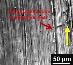 Abrasive wear occurs when a hard rough surface slides across a softer surface.[9] ASTM International defines it as the loss of material due to hard particles or hard protuberances that are forced against and move along a solid surface.[14]