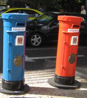 Pillar boxes on the island of Madeira, Portugal. (1st class mail in blue and 2nd class in red)