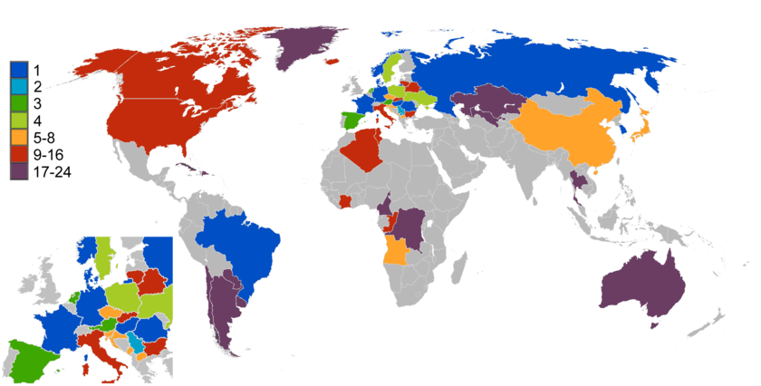 Totals (19 nations) | 23 | 23 | 23 | 69 |