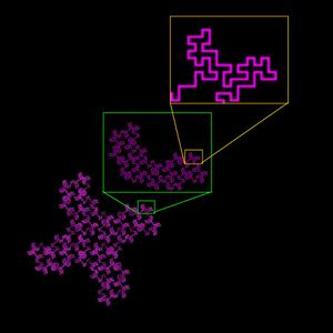Figure 2. A 32-segment quadric fractal scaled and viewed through boxes of different sizes. The pattern illustrates self similarity. The theoretical fractal dimension for this fractal is log32/log8 = 1.67; its empirical fractal dimension from box counting analysis is ±1%[1] using fractal analysis software.