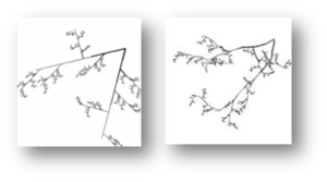 Figure 6. Two L-systems branching fractals that are made by producing 4 new parts for every 1/3 scaling so have the same theoretical as the Koch curve and for which the empirical box counting has been demonstrated with 2% accuracy.[1]