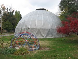 Fuller taught at Black Mountain College in North Carolina during the summers of 1948 and 1949,[4] serving as its Summer Institute director in 1949. There, with the support of a group of professors and students, he began reinventing a project that would make him famous: the geodesic dome. Although the geodesic dome had been created some 30 years earlier by Dr. Walther Bauersfeld, Fuller was awarded United States patents. He is credited for popularizing this type of structure.