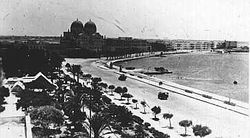 Panorama of Benghazi as viewed from the Port Administration building. Left to right: Former Port Headquarters, Customs Building, Benghazi Cathedral, Port of Benghazi (foreground), Berenice Hotel, Da'wah al-Islamiyah Building, and Geliana Bridge.