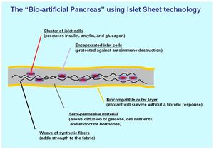 - وسيلة تعتمد الهندسة الحيوية وهو لتطوير بنكرياس حيوي إصطناعي يتكون من مادة متوافقة حيوياً غلاف رقيق كبسولة مزروعة (تشريحيا) من خلايا بيتا. وعندما تزرع جراحيا ، فإن الغلاف من خلايا بيتا سوف تتصرف كما لو كانت داخل البنكرياس وسوف تكون قابلة للاستمرار لسنوات عدة.