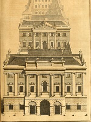The newly built premises, designed by George Sampson, occupied a narrow plot (around 80 أقدام (24 m) wide) extending north from Threadneedle Street.[52] The front building contained transfer offices on the first floor, beneath which was an entrance arch leading to a courtyard. Facing the entrance was the 'main building' of the bank:[53] a large Hall (79 ft × 40 ft (24 m × 12 m)) in which bank notes were issued and exchanged,[54] and where deposits and withdrawals could be made.[40] (Sampson's Great Hall, later known as the Pay Hall, remained in situ and in use until Herbert Baker's comprehensive rebuilding in the late 1920s.)[55] Beyond the Hall was a quadrangle of buildings enclosing a 'spacious and commodious Court-yard' (later known as Bullion Court). On the south side of the quadrangle were the Court Room and Committee Room, on the north side was a large Accountants' Office; on either side were arcaded walkways, with rooms for the senior officers, while the upper floors contained offices and apartments.[52] Beneath the quadrangle were the vaults ('that have very strong Walls and Iron Gates, for the Preservation of the Cash'); access to the courtyard was provided, by way of a passage leading to a 'grand Gateway' on Bartholomew Lane, for the coaches and waggons 'that come frequently loaded with Gold and Silver Bullion'.[53] The pediment above the entrance to the main Hall was decorated with a carved alto relievo figure of Britannia (who had appeared on the common seal of the bank since 30 July 1694);[56] the sculptor was Robert Taylor, who went on to be appointed Architect, in succession to Sampson, in 1764. Inside, the east end of the Hall was dominated by a large statue by John Cheere of King William III,[57] lauded in an accompanying Latin inscription as the bank's founder (conditor);[47] at the opposite end, a large Venetian window looked out on St Christopher's churchyard.