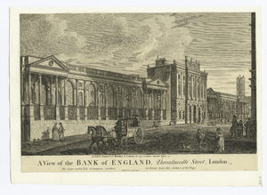 A Perspective View of the Bank of England (published 1756). The bank initially occupied a narrow site on Threadneedle Street: behind the front building stood the pedimented Pay Hall, beyond which lay 'Bullion Court' (and the bank vaults below).