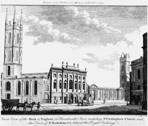 The Bank of England moved to its current location, on the site of Sir John Houblon's house and garden in Threadneedle Street (close by the church of St Christopher le Stocks), in 1734.[51] (The estate had been purchased ten years earlier; Houblon had died in 1712, but his widow lived on in the house until her death in 1731, after which the house was demolished and work on the bank began.)[46]