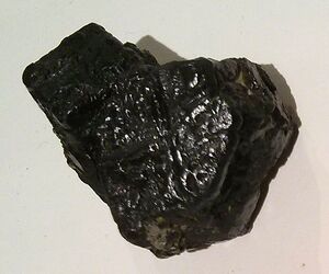 صورة لمعدن البيروفسكيت (تيتانات الكالسيوم) من منطقة كوسا في روسيا. الصورة التقطت في متحف هارفرد للتاريخ الطبيعي.