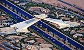 Under structure there are palm trees planted in line along divide-island, as well as other lower trees and ornamental bushes growing on island around palms and at free land space beside four-laned parkway (divided highway). On its sides there is fine-cut boxwood inside tidy gardens, with shaped and perimeter fences, small parking lots and other auxiliary facilities extending into a big complex.