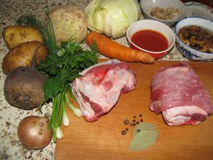 مكونات البورشت قد تضم لحم بقري، لحم الخنزير، شحم الخنزير، بنجر، كرنب، جزر، celeriac, بصل، بطاطس، عش الغراب، معجون الطماطم، مقدونس، chives، شبت، ورق الغار، البهارات والفلفل الأسود.
