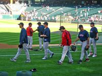 Pitchers (left — right) Josh Beckett, Jon Lester, Éric Gagné, pitching coach John Farrell and Curt Schilling, prior to a Red Sox game at Seattle in August 2007