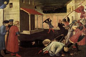 Coptic tradition also tells that his body was still at Baucalis as late as 311 AD, when Pope Peter of Alexandria was martyred at the same site.[8] According to the Martyrdom of St. Peter (Acta or Passio Sancti Petri), the tribunes who would later have him beheaded allowed him to first visit the tomb of St. Mark at "the place called Boukolou." He prayed to St. Mark for his intercession, that he might be martyred joyously. After exiting the tomb, the tribunes beheaded him in an area just south of Mark's martyrium.[2]