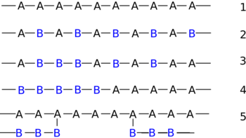 - بوليمير إسهامي متناوب (Alternating copolymers): تناوب منتظم للوحدات A وB، كما في (2).
